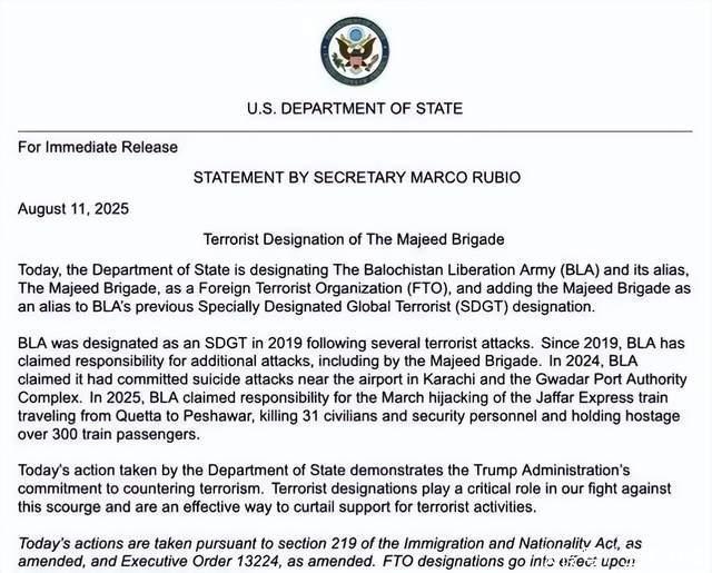 把“俾路支武装”列为恐怖组织,既能让巴基斯坦名正言顺地清剿,又能借巴基斯坦的手削弱潜在风险,可谓一箭双雕。